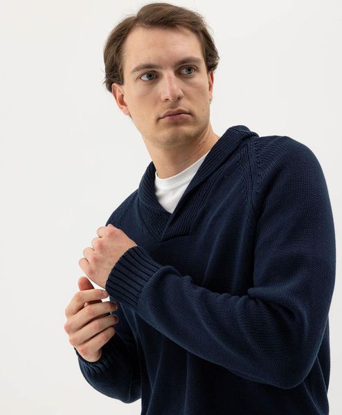 "Elegant knitted sweater made from organic cotton with a ribbed shawl collar, ideal for everyday urban life and sustainable fashion."
