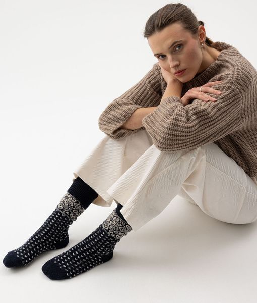 "The Sundborn Raggsocka from Holebrook are classic, patterned wool socks that impress with their two-tone design and high qualityu00e4t. These socks combine traditional knitting craftsmanship with modern comfort and are the ideal companion for cold days. The ribbed and elasticated cuff ensures that the socks fit perfectly and do not slip, while the natural properties of the wool ensure pleasant warmth and breathability."