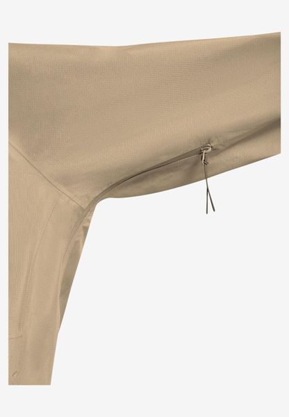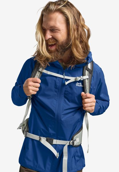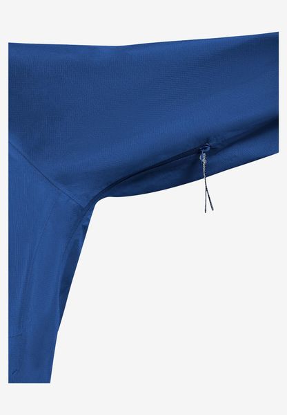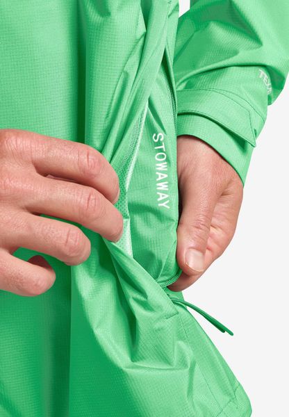 "With a permanently attached, adjustable hood and adjustable cuffs, the jacket adapts perfectly to every movement. Two practical hip pockets provide sufficient storage space for important items, while waterproof zips and zips at the armpits offer additional functionality and ventilation. Despite its comprehensive features, the jacket can be folded up compactly and easily stowed in a rucksack, making it the perfect companion for any hike"