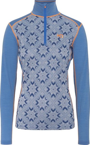 "The Kari Traa Iselin Half Zip is the ideal companion for anyone who doesn't want to compromise on style and comfort even on cooler days. Made from high-quality merino wool with a micron value of 19.5, this garment offers a luxurious feel that impresses with its excellent thermal insulation, even when wet. The cosy high collar ensures that you always stay warm and cosy, while the striking Nordic pattern with bright colour blocking adds a special touch to your outfit."
