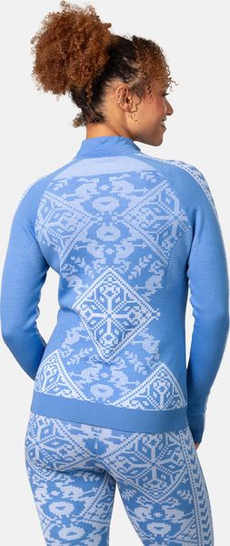 "This baselayer not only impresses with its functionality, but also with its Scandinavian-inspired knitted patternlook, which is subtle yet stylish. The strategically placed mesh inserts and half zip fastening ensure optimum ventilation to keep you comfortable even during intense activity. The practical thumb loops keep the sleeves in place and offer additional protection against cold."