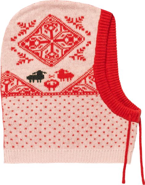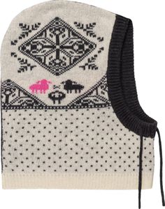 "Warm and stylish women's balaclava made from ethically produced merino wool with a Scandinavian pattern, ideal for winter activities."