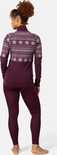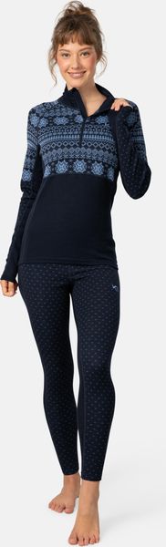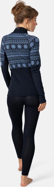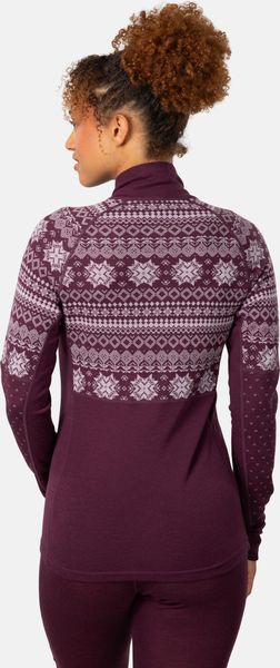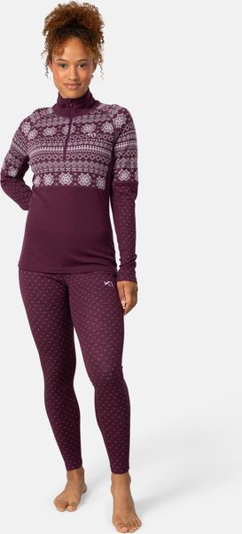 "The Vilma Half Zip by Kari Traa is the ideal baselayer for women who value warmth and comfort. Made from 100% ethically sourced merino wool, this slim fit pullover offers excellent insulation properties, even in wet conditions. The high-quality wool fibers with a thickness of 19.5 microns ensure a luxuriously soft feel. The Vilma Half Zip impresses with its elegant jacquard knit pattern, reminiscent of soft snowfall, and combines style with functionality."