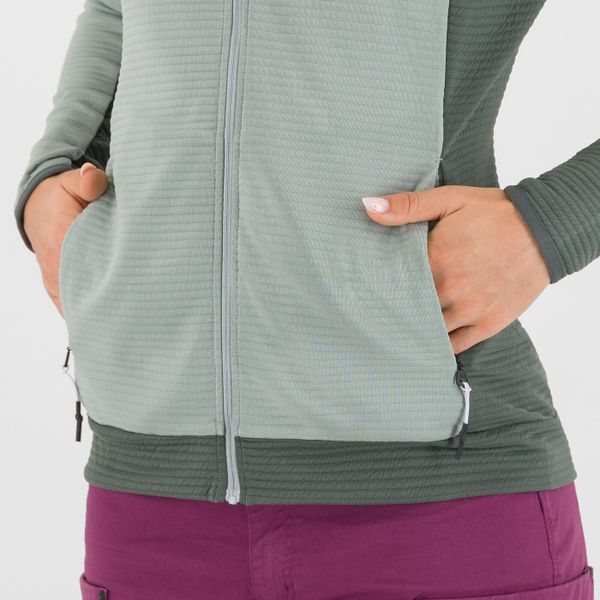 "Lightweight and stretchy women's fleece jacket with recycled material, ideal for outdoor activities such as hiking and mountaineering."