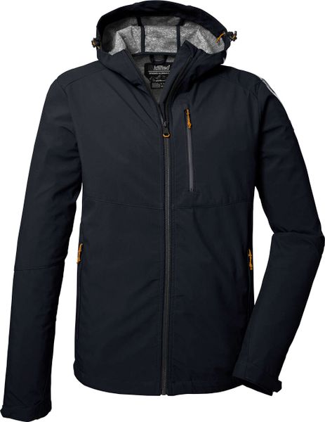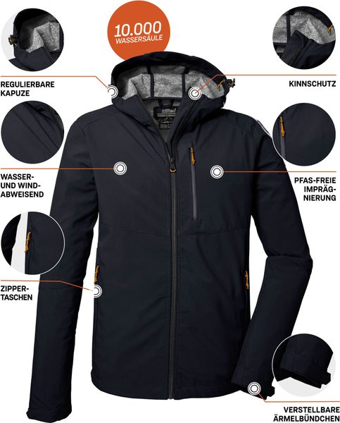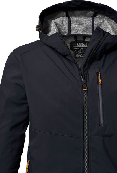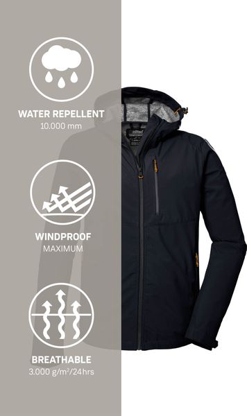 "The KOS 259 men's softshell jacket from killtec is the ideal companion for anyone who wants to be active outdoors in wind and weather. Thanks to its windproof and water-repellent properties and an impressive 10,000 mm water column, it reliably protects against the elements. The jacket not only impresses with its functionality, but also with its environmentally conscious manufacture: it is PFAS-free impregnated and is partly made from recycled material."