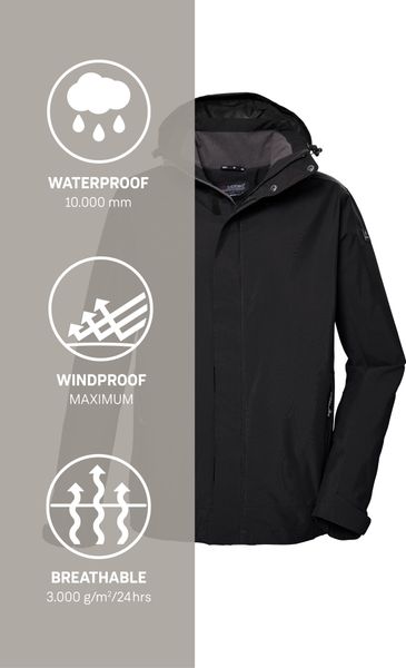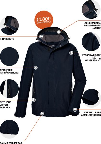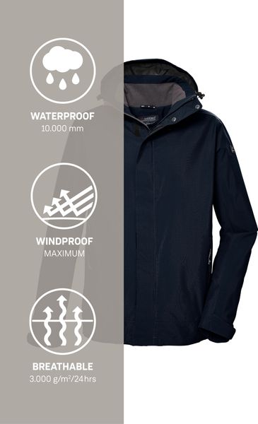 "The KOS 87 Men Jckt_xenios by killtec is a highly functional men's jacket, ideal for outdooradventures in any weather. This functional jacket features a zip-off hood and welded seams that make it waterproof and windproof. With an impressive wateru00e4ule of 10,000 mm, you are well protected against the rain. At the same time, the jacket's breathability with a water vapor permeability of 3,000 g/mu00b2/24h ensures that you always feel comfortable and don't break a sweat."