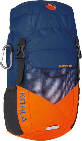 "Happy 15L children's backpack u2013 for children aged 7 to 14u2013. Our children's collection "Happy" enters the next round and takes comfort and outdoorfeeling to a whole new level. In addition to the entry-level model for kindergarten children, Koha's shoulder model is slightly larger with a volume of 15 liters and offers sufficient storage space for hikes and excursions. The robust nylon outer material of the Happy 15L is water-repellent and color-fast, which means that the colors of the backpack hardly fade at all. In the main compartment, which can be closed with a drawstring, there is a slip pocket with a removable seat cushion and another small zipper compartment. The children's backpack offers additional storage space in the lid. Keys, a cell phone and other small items can be stored in the Velcro compartment on the front. A reflector ensures good visibility in the dark. The two elastic mesh pockets on the side offer space for water bottles. In addition, a cap or similar item can be attached to the detachable carabiner. Our 3-D Mesh Back Panel System and the special Junior carrying straps are breathable and ergonomically shaped. The infinitely adjustable chest strap ensures an optimum fit. All in all, the Happy 15L backpack is a great companion for school, sports and outdoors!"