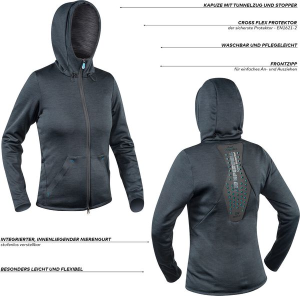 "The Full Zip Hoody W's from Komperdell is the perfect combination of style and safety. This hoody is not only a fashion highlight, but also offers optimum protection thanks to its multi-layered Cross FLEXRu00fcckenprotector. The integrated protector is made from adaptive Dual-Density Foam, which adapts flexibly to the body while meeting the highest safety standards. Ideal for anyone who doesn't want to compromise on comfort and protection during outdoor activities."
