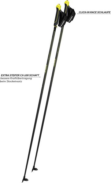 "The ergonomically shaped rubbergrips offer excellent grip and ensure that your hands do not get tired even on longer tours. The CX-100 shaft is specially designed for dynamic movements and helps you to transfer your power optimally to the end of the terrain. Whether you are skiing on groomed trails or on open terrain, this pole offers you the flexibility and safety you need."