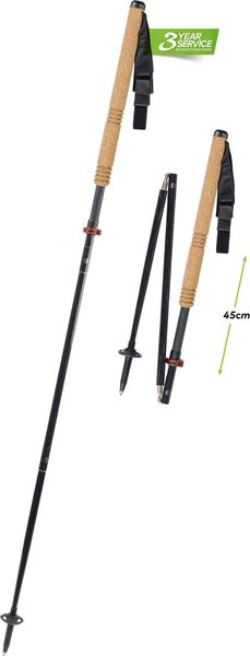 "Made from a lightweight carbon composite and divided into four segments, the pole offers maximum stability and flexibility. The Powerlock 3.0 system, made of forged aluminum, guarantees a secure fixation of the segments. The Cork Foam Traveler handle not only offers a comfortable grip, but is also equipped with a camera-static system u2013 ideal for travel-loving adventurers who want to capture special momentsu2013."