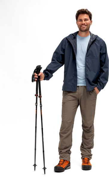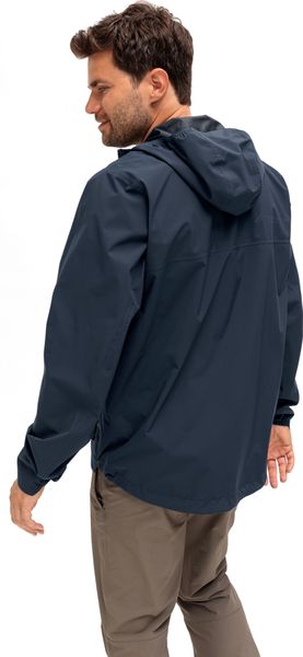 "Lightweight, waterproof men's jacket for outdoor activities with adjustable hood and environmentally friendly, water-repellent fabric."