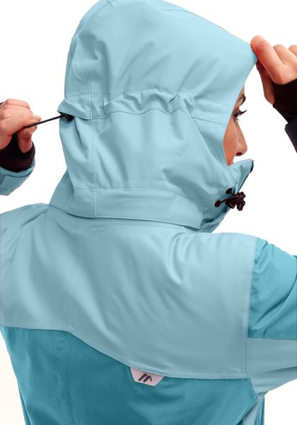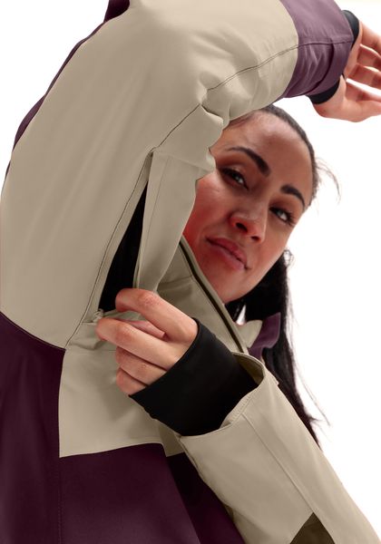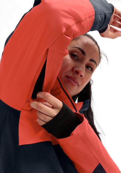 "The jacket's well thought-out details are particularly practical: the underarm ventilation ensures pleasant freshness, while the elasticated cuffs with thumb holes keep the warmth close to the body and ensure a secure fit. The integrated snow guard reliably protects against penetrating snow and the detachable hood can be individually adjusted. The adjustable hem offers additional protection and comfort"
