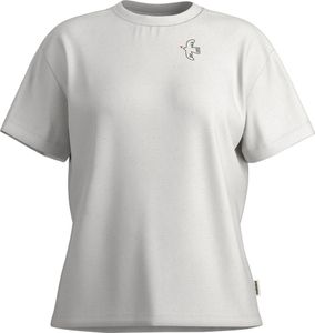 "The CASSETTEM. T-shirt by Maloja is a loose-fitting basic made from high-quality organiccotton. This ladies-T shirt with cropped sleeves and a wide ribbed collar not only offers comfort, but also an urban style that is perfect for everyday wear and the workplace. The front of the shirt features a small, hand-drawn print depicting a dove with a heart and the Maloja lettering. The large print on the back underlines the unique character of this shirt and makes it a real eye-catcher in any wardrobe."
