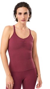 "The gathering in the bust area gives the top a feminine touch and ensures a flattering fit. The crossed straps at the back are not only a fashion highlight, but also provide additional stability during training. With a body height of 1.70 m, the close-fitting top reaches up to the hips and is ideal for yoga, Pilates or everyday use."