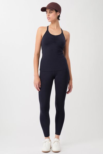 "The gathering in the bust area gives the top a feminine touch and ensures a flattering fit. The crossed straps at the back are not only a fashion highlight, but also provide additional stability during training. With a body height of 1.70 m, the close-fitting top reaches up to the hips and is ideal for yoga, Pilates or everyday use."