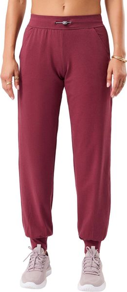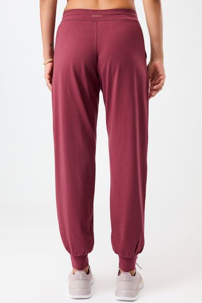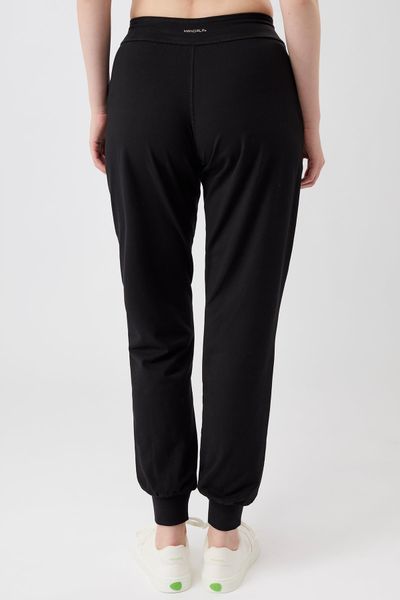 "The trousers have two practical slit pockets at the front, which offer enough space for a cell phone, keys and other small items. An elasticated waistband with fastening ensures a perfect fit, while soft cuffs at the bottom of the legs guarantee additional comfort. The mid-rise waistband and full length of the trousers underline their fashionable yet functional character."