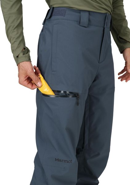 - Marmot NanoPro™ Eco is a sustainable, lightweight and breathable waterproof technology that sheds rain so you stay dry inside and out - for high performance in extremely wet weather | 100% taped seams provide fully sealed protection and added waterproofing so water can't penetrate your jacket even in wet weather | PrimaLoft® Black insulation is sustainably made from 80% post-consumer recycled materials - for eco-friendly, breathable warmth | Adjustable snap waist and zippered fly ensure a snug fit and comfort | Adjustable VELCRO® waist lets you adjust the pants to your exact size | Hand and thigh pockets with watertight pockets for storage and thigh pockets with waterproof zippers keep valuables and other small stowed items dry even when wet | The CORDURA® abrasion protection is abrasion-resistant, providing additional durability and resistance | Ventilation openings on the trouser legs with waterproof zippers allow you to regulate the air flow into the pants and stay dry at the same time