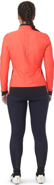 "The Cosmic Storm Jacket W impresses with its body-hugging slim-fit fit, which has been specially optimized for the aerodynamic position on the road bike. Glued seams and silicone prints on the bottom hem ensure that the jacket fits perfectly and does not slip. The high-quality nylon material is not only extremely stretchy, but also durable and resistant."