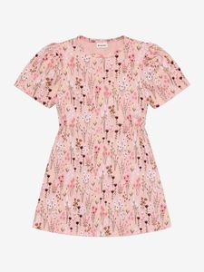 "Playful floral print girl's dress, GOTS-certified, made of cotton, with puff sleeves and a flared skirt."