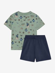 "Discover the comfortable and stylish Nightset SS AOP from Minymo, specially designed for boys. This two-piece pyjama set consists of a short-sleeved T-shirt and matching shorts, which ensure comfortable comfort and soft dreams. The Tshirt features a round neckline and a vibrant all-overprint for a fresh look. The plain-colored shorts are equipped with an elastic waistband for optimal comfort and freedom of movement."