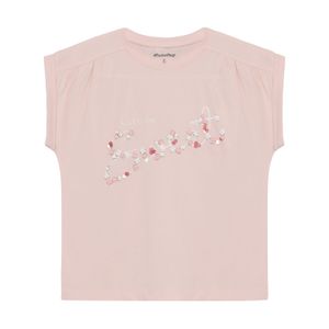 "Discover the stylish T-shirt from Minymo, specially designed for girls. Made from high-quality cotton, this T shirt is not only comfortable to wear, but also offers excellent breathability, ideal for active days. The plain-colored design is refreshed by a modern text print on the front, which gives the shirt a trendy look. The small pleats on the shoulders add a charming detail that rounds off the overall look and gives the T shirt a special touch. Perfect for everyday wear or special occasions, this T-shirt can be combined in a variety of ways and is a must-have in every young fashionista's wardrobe."