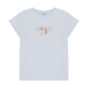 "Comfortable cotton T-shirt for girls with a playful print and delicate ruffles at the cuffs."