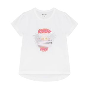 "Single-colored cotton girls' T-shirt with a print on the front and fashionable puff sleeves for a playful look."