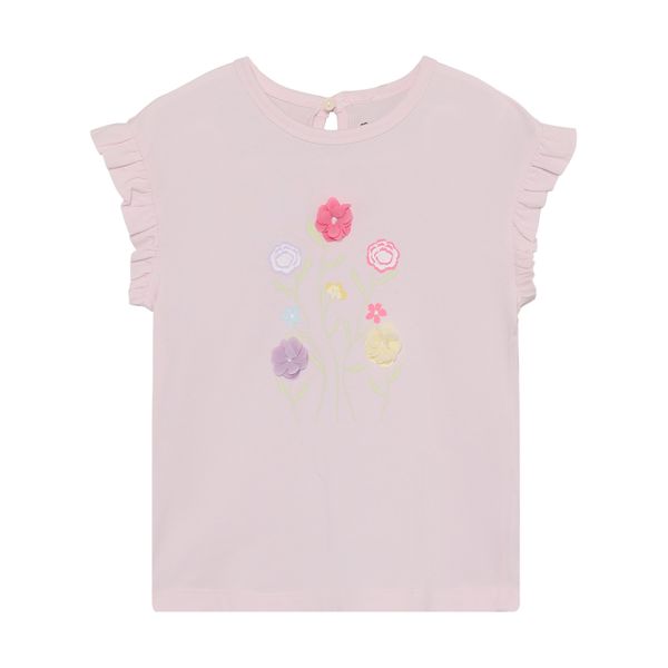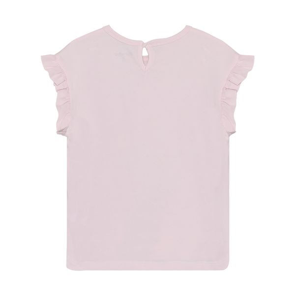 "Single-colored cotton T-shirt for girls with a front print and fashionable ruffled sleeves."