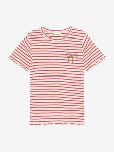 "The short-sleeved ribbed shirt from Minymo is the perfect addition to any girl's wardrobe. It features a striped design and charming scalloped trims on the sleeves and hem, which give the shirt a playful yet stylish look. The pretty bow print on one side of the chest is an additional eye-catcher that gives the T shirt a special touch"