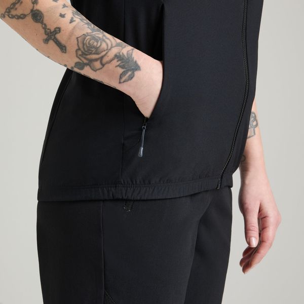 "With its 4-weave-stretch material, the vest ensures unrestricted freedom of movement and a perfect fit. The elasticated inserts on the hood, armholes and hem provide additional comfort so that you can concentrate fully on your activities during urban adventures or sports. The side zipped pockets offer practical storage space for your keys, cell phone or other small items."
