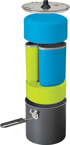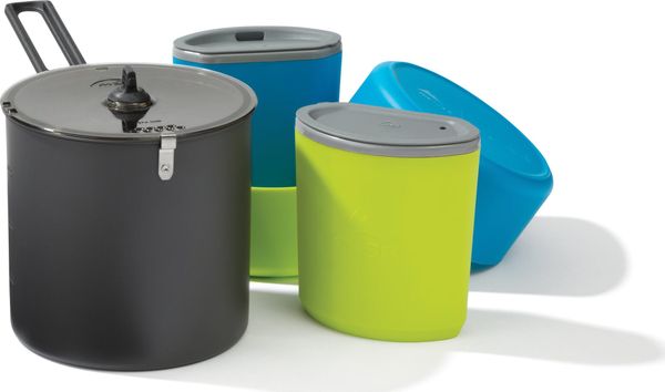 The set includes two color-coded DeepDish™ bowls and double-walled insulated mugs made of BPA-free polypropylene, which are suitable for both hot and cold food. These can be stored in the pot to save space, so that no additional space is required in the rucksack. The foldable, lockable handle ensures that the entire set remains safely stowed away while you are on the go.