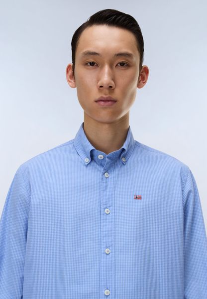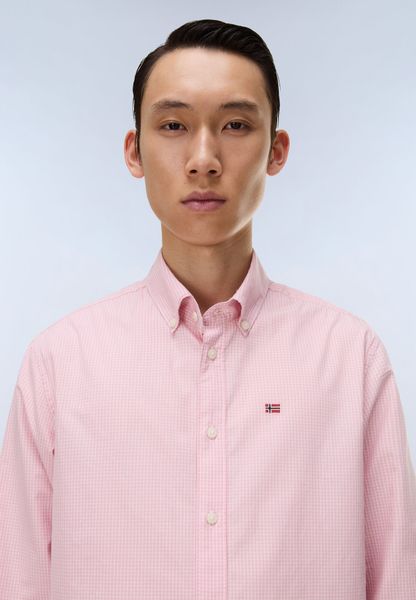 "A particular highlight is the button-down collar, which gives the shirt a modern yet elegant look. The cuffs with buttons underline the classic design and offer additional adjustment options. A visual detail is the embroidered Norwegian flag on the chest, which gives the shirt a special touch and emphasizes the Napapijri brand identity"
