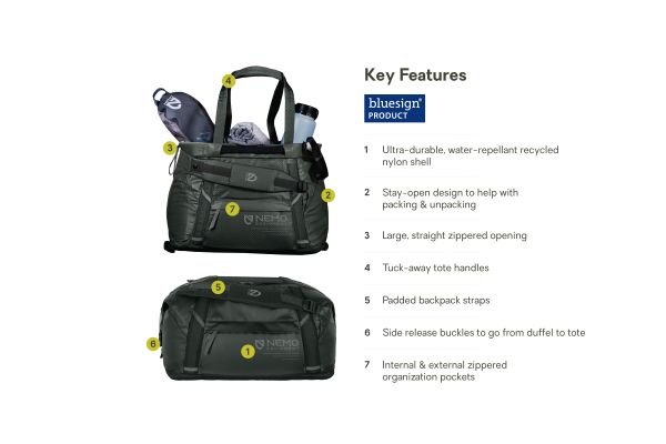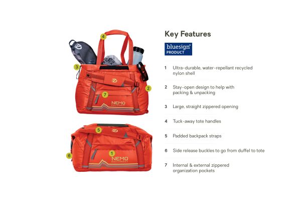 "The bombproof Double Haulu2122 is a revolutionary combination duffel and duffel bag that meets all the needs of an adventurer. With a huge opening structured to stay wide when packed, the bag folds into a duffel for long trips and air travel, complete with self-contained, undetectable backpack straps. If you simply need to transport something, you can use the stowable handles of the tote bag for extra capacity and easy organization. Double Haul is a bluesignu00ae-certified product made from recycled materials and manufactured to the highest standards to protect people and the environment. The ultra-durable outer material is made from bluesignu00ae-certified 420Drecyclednylon, which is then treated with urethane to resist water and stains. Side buckles quickly transform the bag from a duffel to a tote, and stiffened crossbars provide a structure that keeps the bag upright and open for easy packing. Inner and outer mesh pockets with zipper closure provide integrated organization options, and all bags come with a matching carry bag that can also serve as a packing mat. Whether you are packing for a whole day followed by a visit to the gym or for a short overnight trip, with Double Haul you have everything under control. With its thoughtful design built for durability and easy repairs, it's an investment built for a lifetime of adventures."