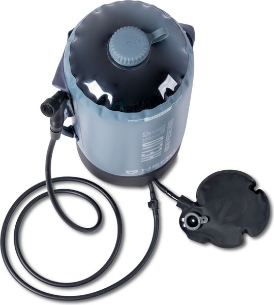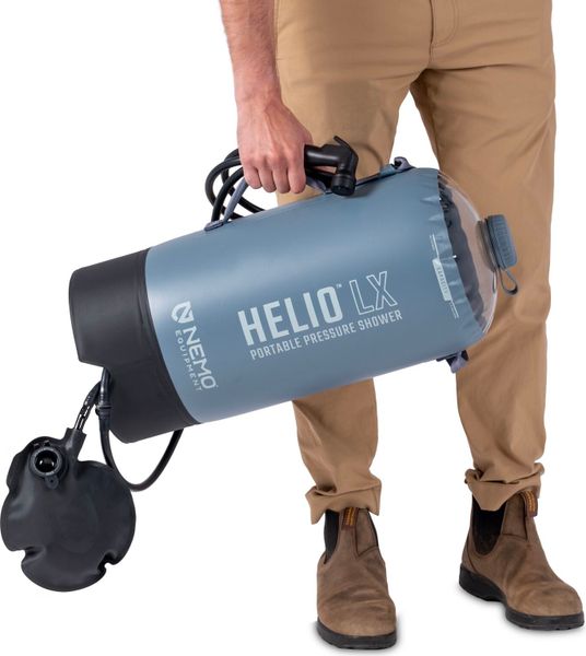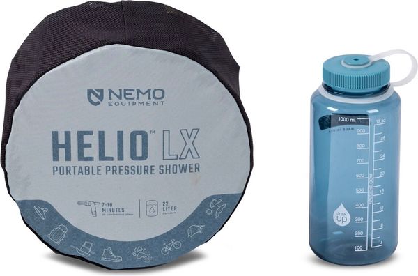 "The Helio LX pressure shower from Nemo is the perfect companion for your outdoor adventures, be it hiking, camping or other leisure activities. With a generous capacity of 22 liters and a 2 meter neoprene tube, it offers comfort and flexibility wherever you are. Thanks to the innovative pressure pump, you don't need any suspension, as the tank stands securely on the ground and provides consistent water pressure for 7 to 10 minutes."