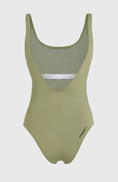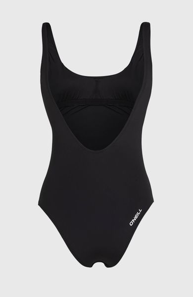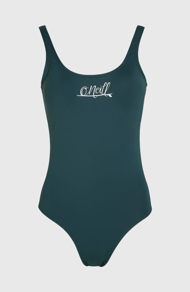 "The Essentials O'Neill Script swimsuit impresses with its minimalist design and versatility. With an elegant open back and a round neckline, this swimsuit is ideal for relaxed days at the beach or in the pool. The clear lettering on the chest adds a stylish touch, while the moderate coverage of the bottom ensures a flattering fit."