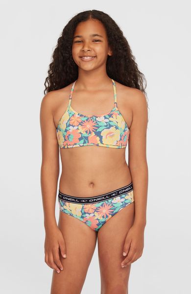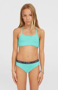 "The O'Neill Sportclub bikini set is the perfect choice for anyone who enjoys spending time in the water, whether it's swimming, water sports or just relaxing on the beach. This set combines functionality with an appealing design and ensures that you feel comfortable in any situation. The bralette top offers a firm hold thanks to the fixed straps and is equipped with removable pads from size 140 upwards to ensure a customized fit. The elastic waistband with logo stripes on the trousers provides additional comfort and stylish accents"