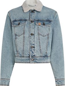 "Fashionable women's denim jacket with fleece lining in an acid-wash look for warmth and style in everyday urban life."