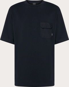 "A stylish 100% cotton T-shirt with nylon flap pocket and Oakley logo, perfect for everyday wear and leisure."