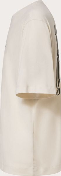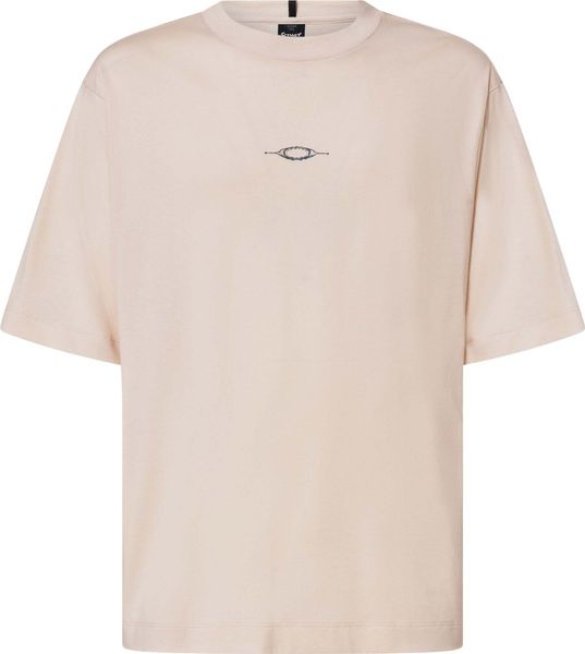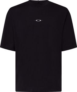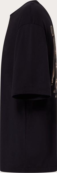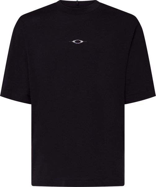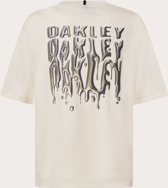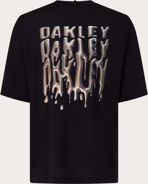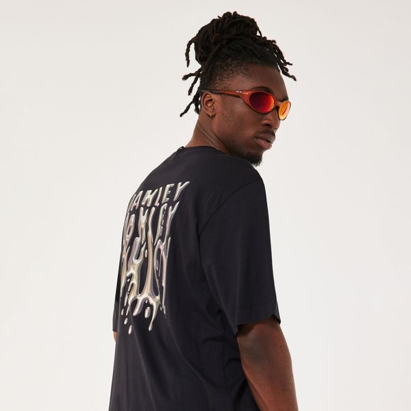 "On the front, the T shirt features a discreet Oakley Ellipse logo, which offers a minimalist and stylish look. The real eye-catcher, however, is the eye-catching Oakley print made of melted metal on the back, which gives the shirt an original and unique touch. A special highlight is the practical glasses strap holder on the back, which was specially developed for glasses wearers to provide additional comfort."