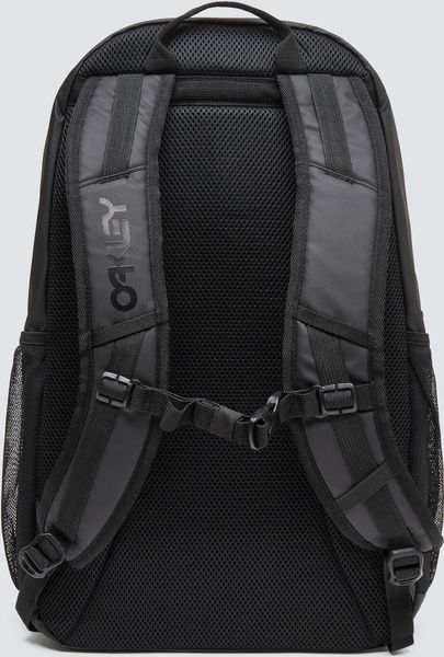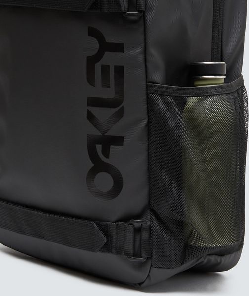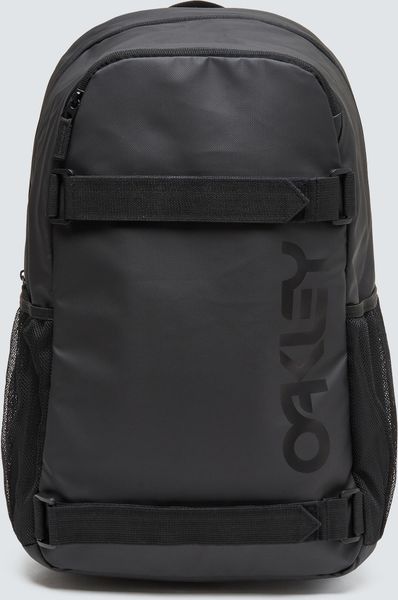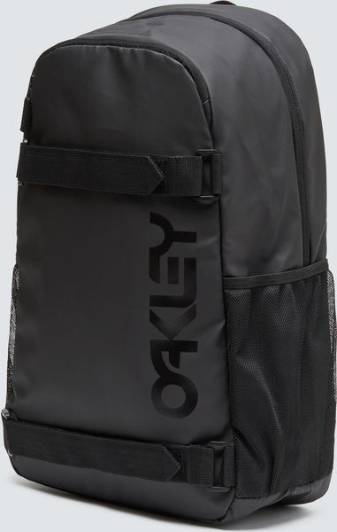 "Additional features such as the front zippered pocket, mesh side pockets and adjustable skatestrap make this backpack particularly versatile. The textured bottom provides additional protection for your gear, and the bold Oakley B1B logo on the front and shoulder straps makes a stylish statement."