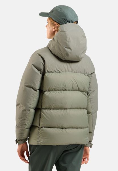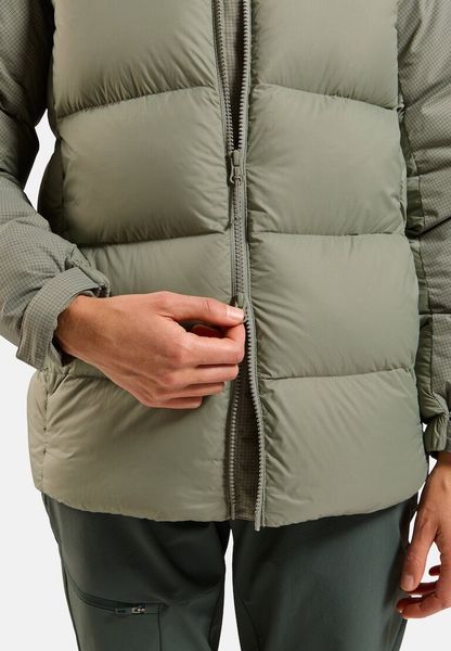 "Lightweight, waterproof women's jacket with adjustable hood and sustainable down filling for optimum protection when hiking."
