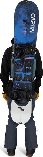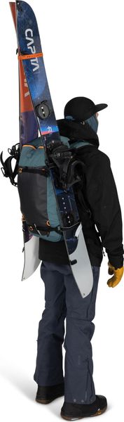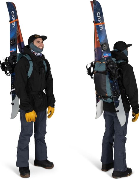 - "With snow-repellent back plate, diagonal and A-frame ski holder, snowboard holder, ice axe holder and intuitive access to the avalanche equipment."
