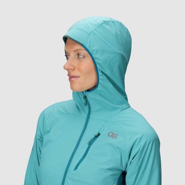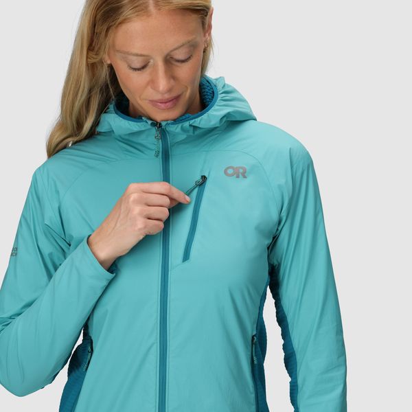 "The Women's Deviator Hoodie from Outdoor Research is the ideal companion for active women who like to be out and about in nature. Whether trekking on longer tours, speed hiking, freeskiing or runningu2013 this hooded jacket offers the perfect mix of lightness and breathabilityu00e4t. The lightweight, breathable knitted insulation on the hood, shoulders, sleeves and front ensures that you always stay at the perfect temperature, while strategically placed weather protection and stretch materials offer you the freedom of movement you need."