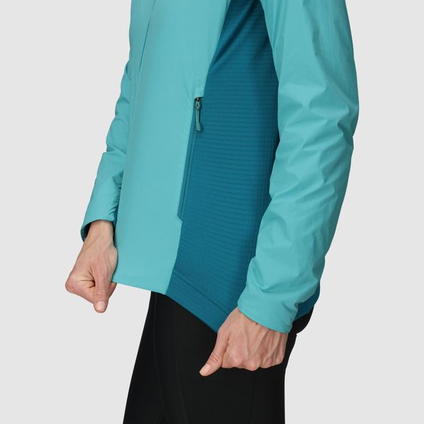 "Lightweight, breathable women's hoodie with a hybrid design for optimum performance during outdoor activities."
