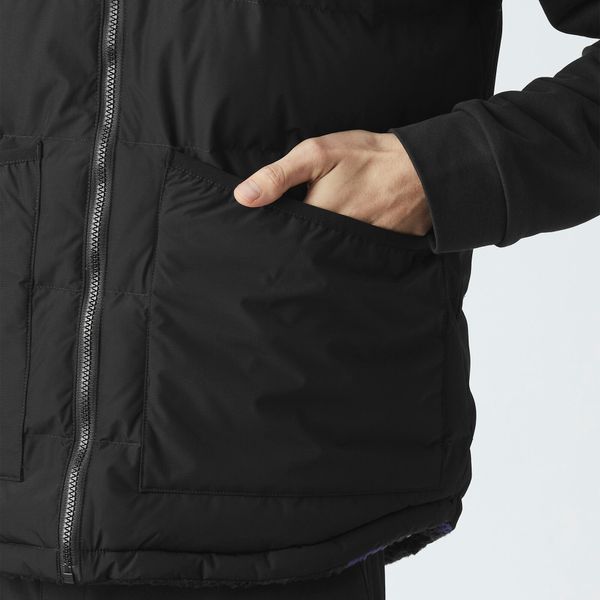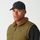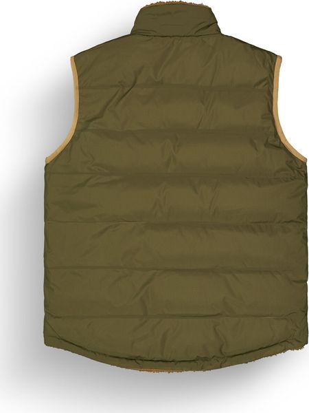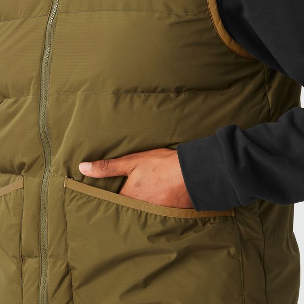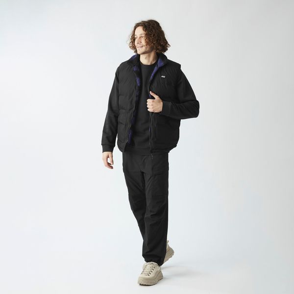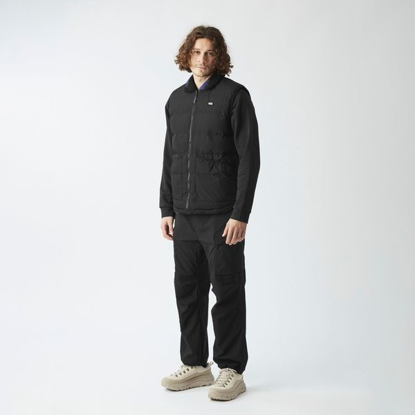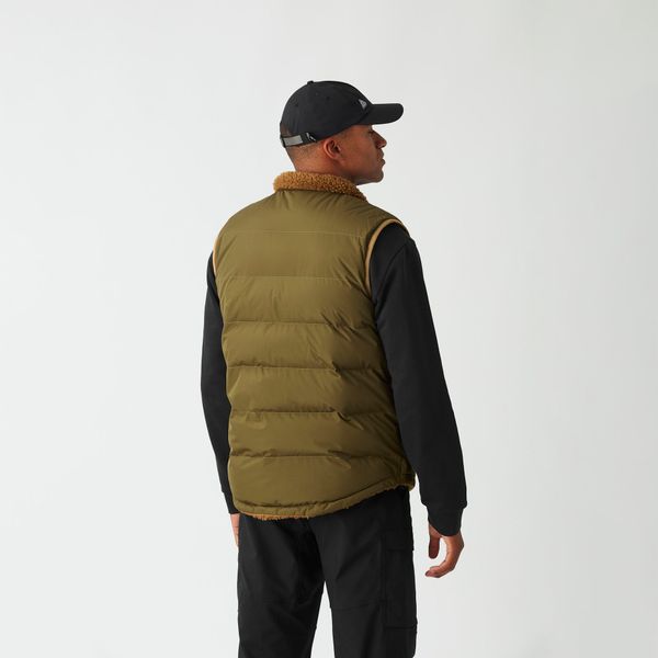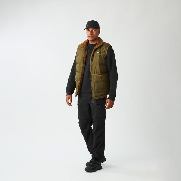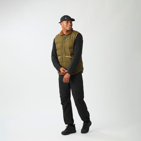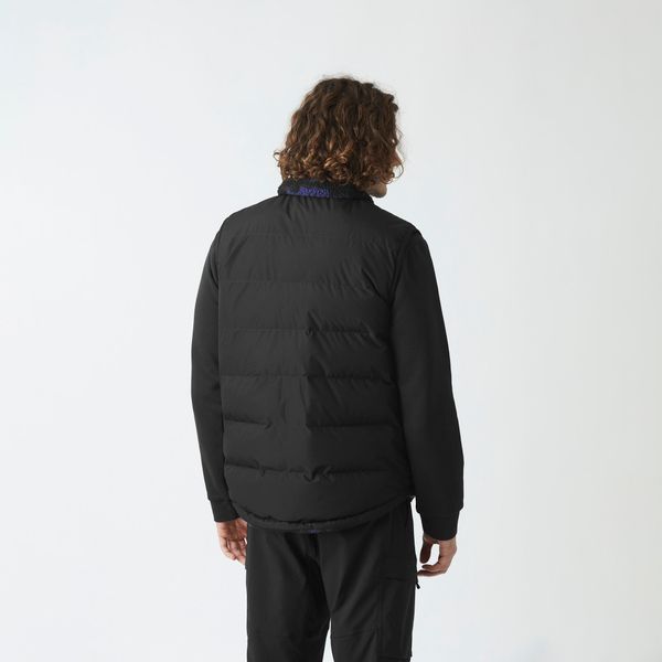 "Sustainable, reversible puffer vest for men with recycled insulation and a versatile design for winter activities."
