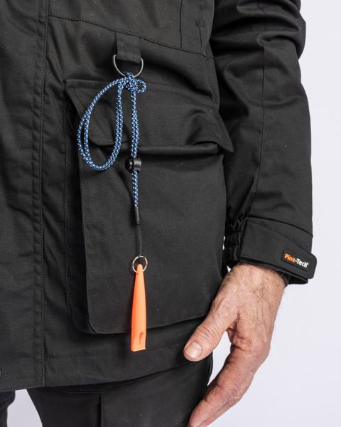 "For added comfort and functionality, the D-ring and carabiner at the waist are ideal for carrying equipment. Whether hiking or training, the Dog Sports Trainer Extreme jacket is designed to support you and your dog in all weathers."