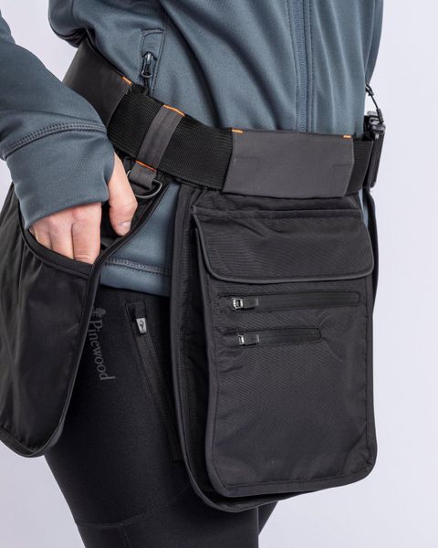 "The Pinewoodu00u00ae Dog Sports Utility Belt is the ideal companion for all dog lovers who like to be active on the gou00f. This multifunctional belt offers everything you need for effective dog training. Equipped with an adjustable hip belt, it adapts perfectly to your needs and ensures a comfortable fit. The two large front pockets with practical magnetic closure allow quick and easy access to your utensils. One of the front pockets contains a removable, orange treat bag with a zipper, which is perfect for storing rewards. There is also an integrated rubber opening for dog waste bags to make disposal on the go easier"