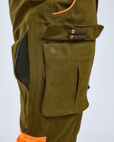 "The breathable mesh lining on the inside of the trousers, together with side ventilation zips, ensures excellent air circulation, which is particularly beneficial during intensive movement. The hunting trousers have numerous practical pockets, including open slit pockets and leg pockets with pleated inserts and magnetic flaps that offer integrated cartridge holders. Adjustable leg cuffs with Velcro fasteners allow individual adjustment to different hunting conditions"