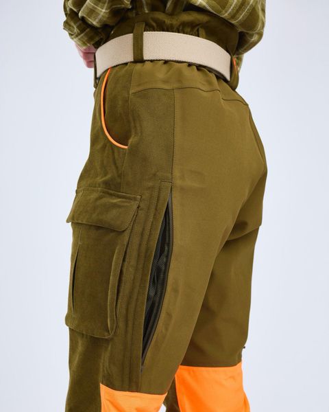 "The back of the trousers is made of 4-wege stretch fabric, which ensures additional comfort and freedom of movement. The inside of the trousers is equipped with a breathable mesh lining, while side ventilation zips improve air circulation during movement. Practical details such as open slit pockets, leg pockets with pleated inserts and magnetic flaps as well as integrated cartridge holders make these trousers an indispensable companion on the hunt."