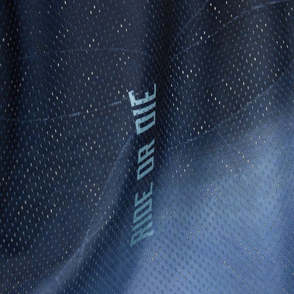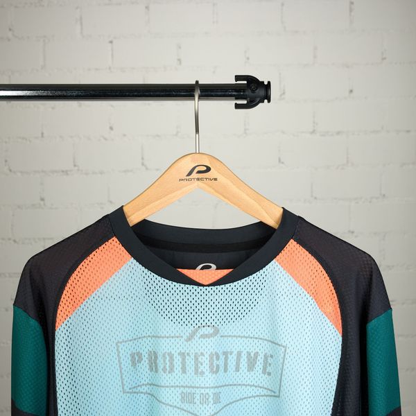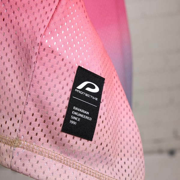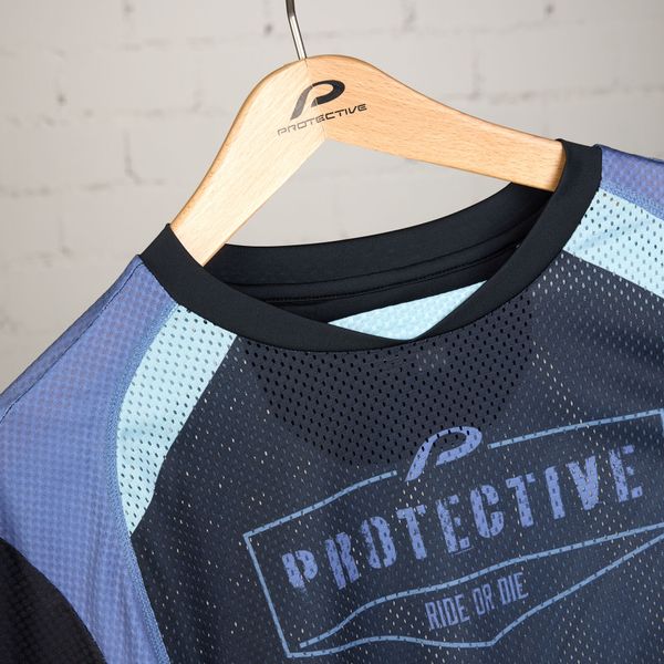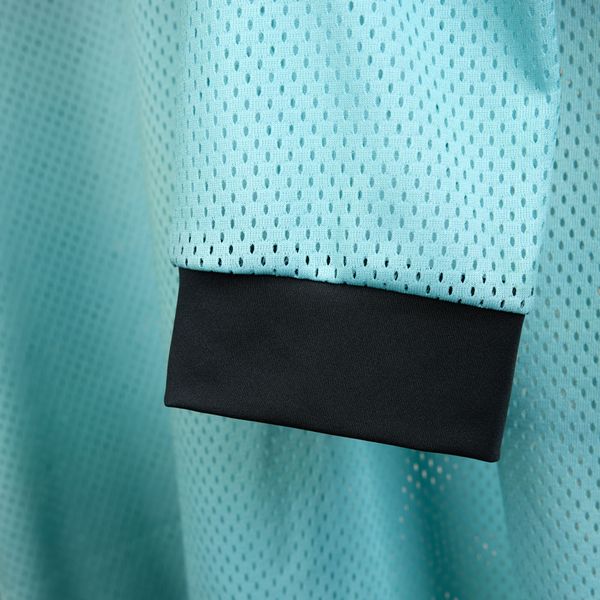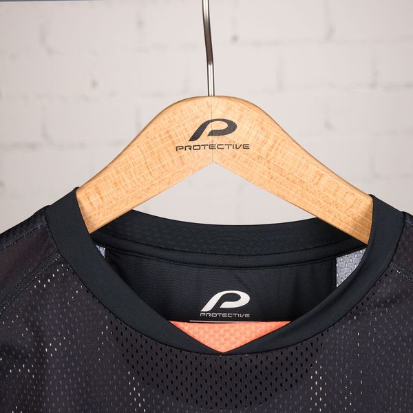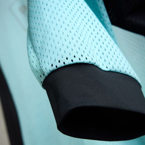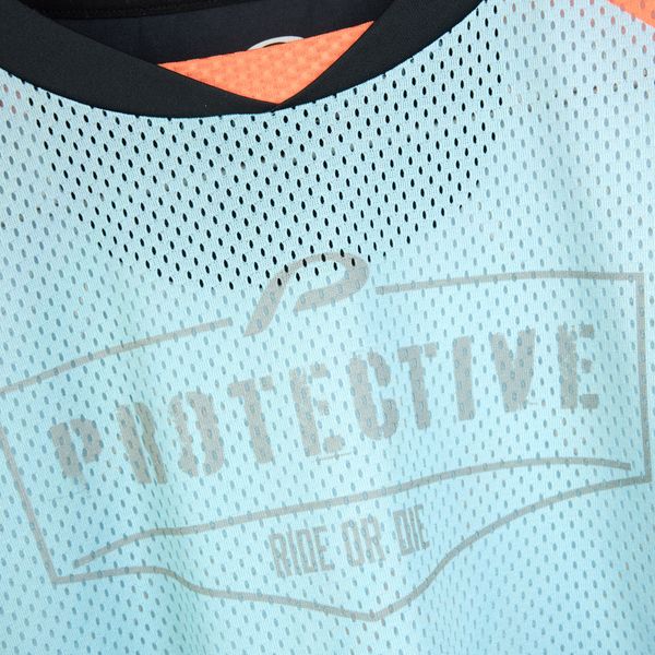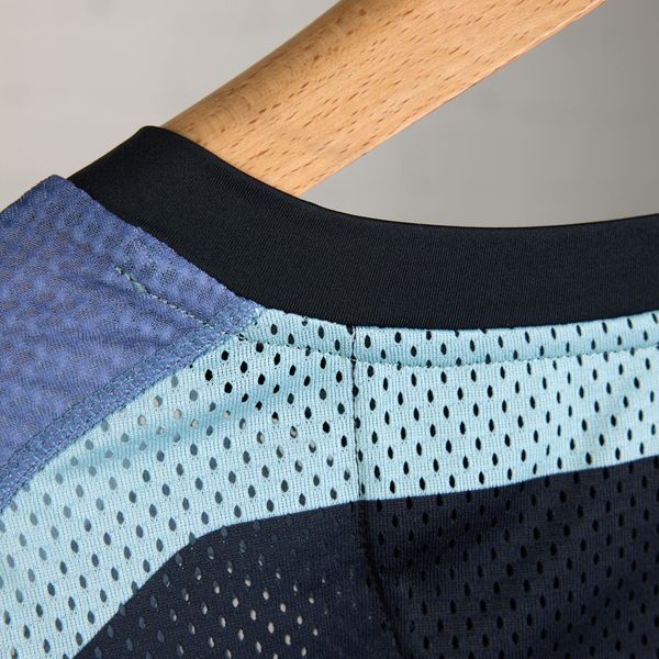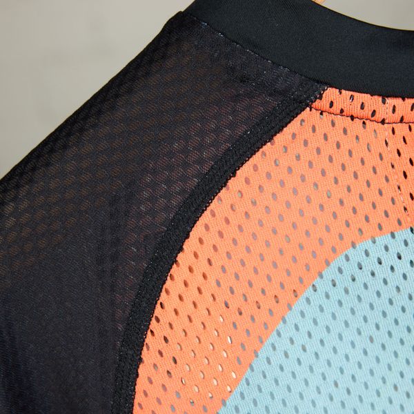 - "breathable mesh material, round neckline,"